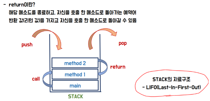 • 메서드는 스택자료 구조 : 먼저 들어오면 제일 늦게 나가고 제일 늦게 들어오면 가장 빨리 나간다.