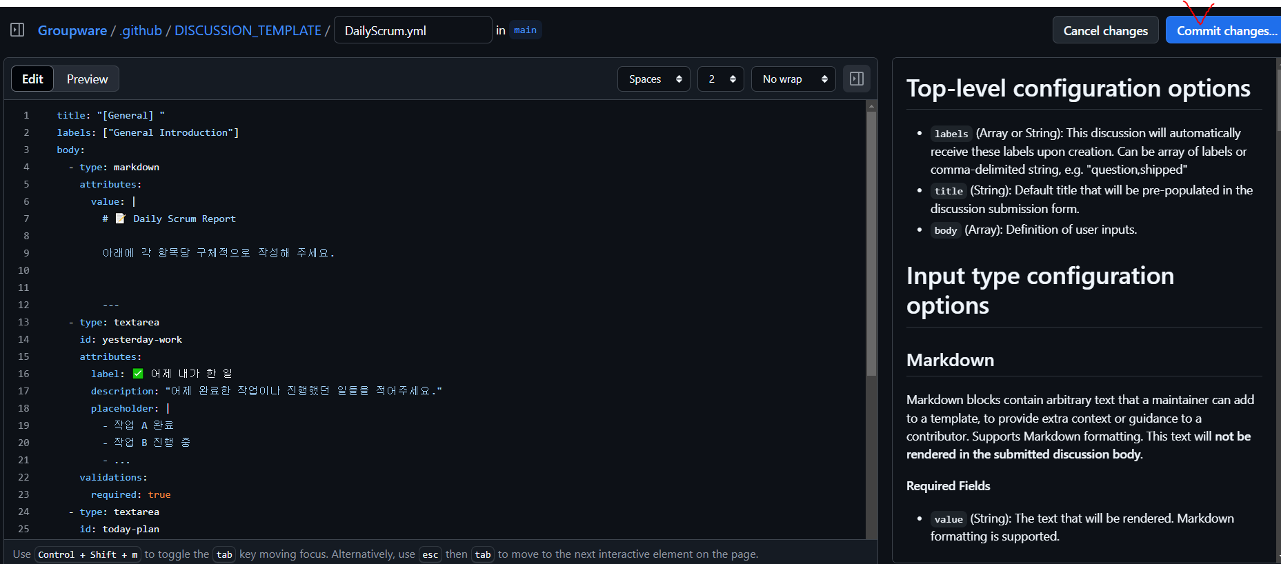 Git hub Issue 템플릿 만드는 것과는 다르게 Discussions 템플릿은 꽤 까다로운 편이다.