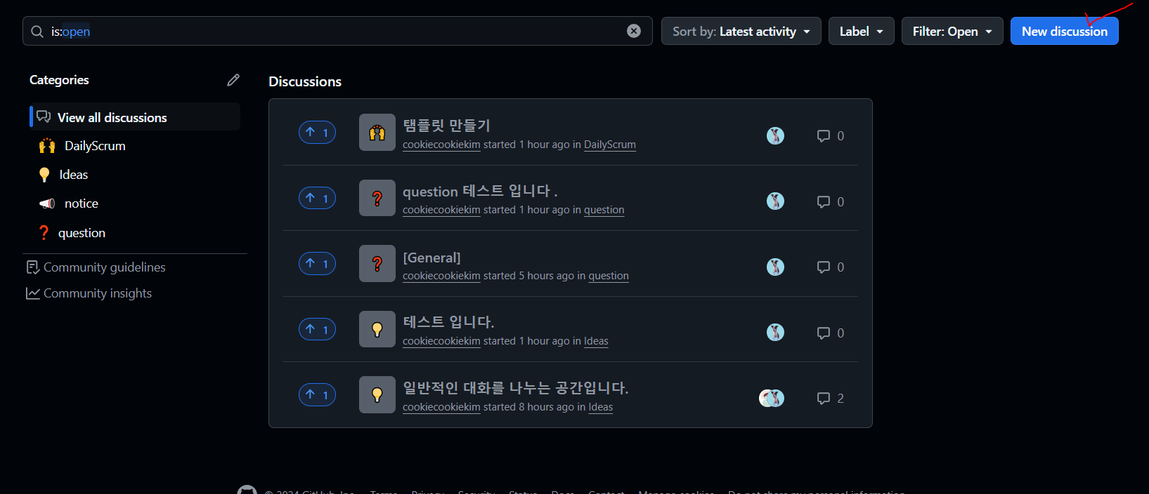 간단한 정리를 해보자면 Discussions Template이란 Github에서 지원하는 팀 원들간의 자유로운 소통 공간이다.