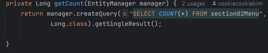 마지막 getSingleReulst() 메서드는 JPA에서 쿼리 실행 결과로 단일 결과를 반환받기 위해 사용되는 메서드이다.