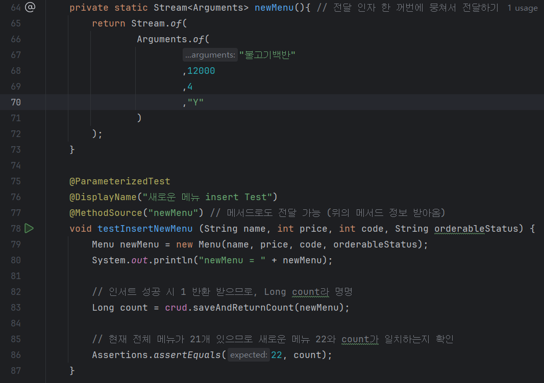 일단 Test 클래스에서 @MethodSource 어노테이션을 이용하여 메서드로 전달받고,
