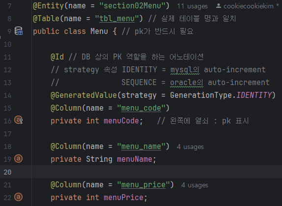 FROM 절 작성 시에는 실제 DB의 테이블 명을 적는 게 아니라, 아래에 @Entity 등록해 놓은 name 속성을 적어준다.
