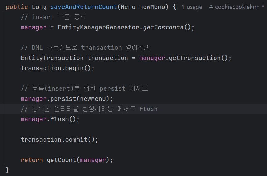 이전에 담아 놓은 newMenu를 전달하여 insert해준다 (persist)