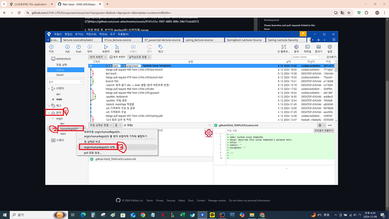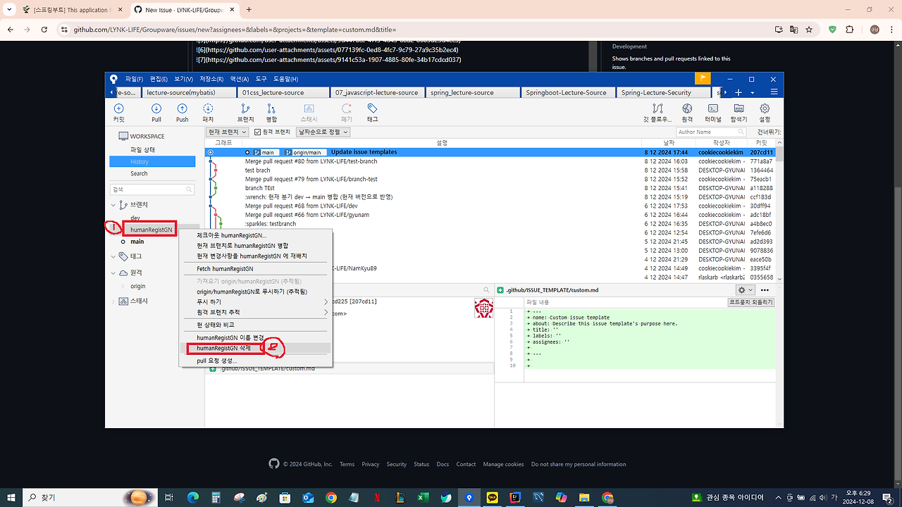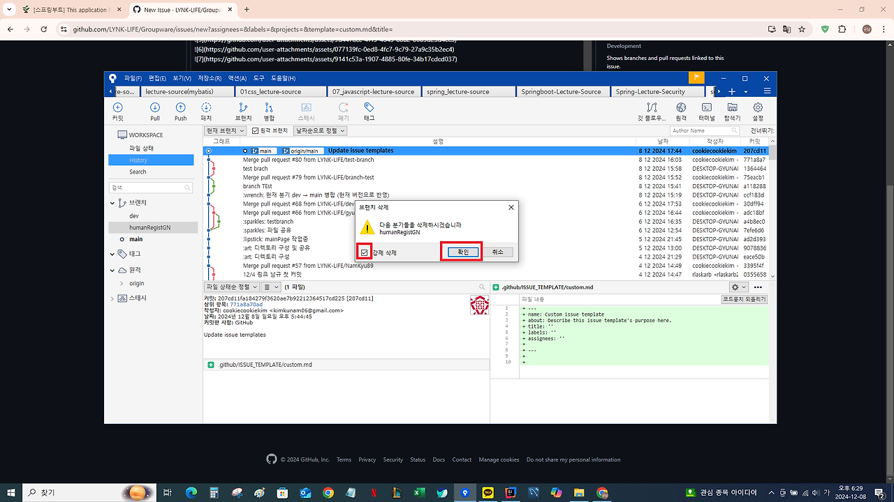 - main에 merge 완료 후 본인의 브랜치 모두 '강제'삭제 (로컬 / 원격)