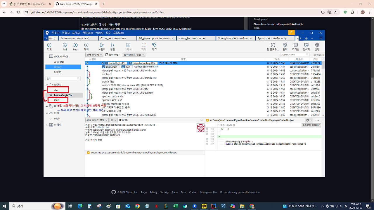 - 본인 브랜치에 수정 사항 커밋 (PUSH 금지)