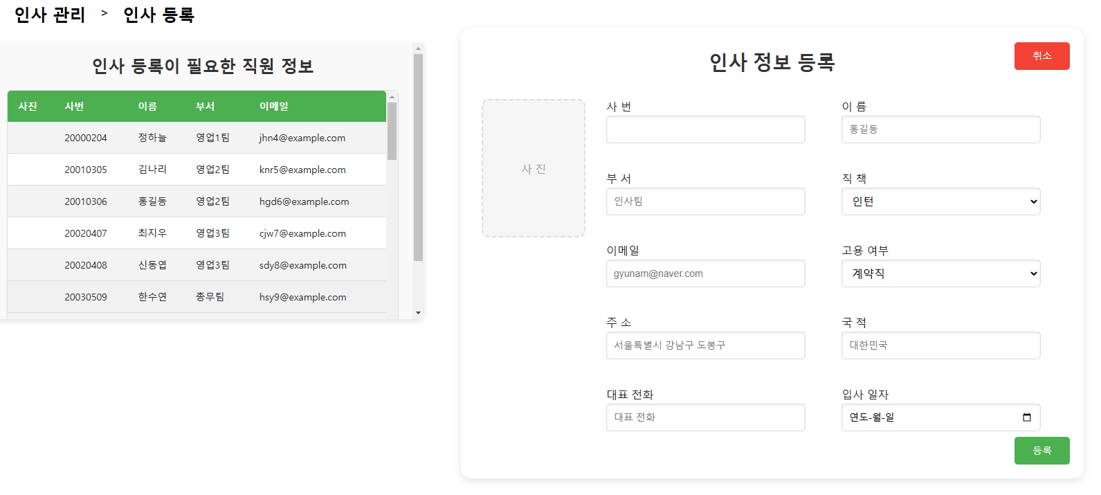 '인사 등록이 필요한 직원'을 클릭(click 이벤트)하면 동적으로 우측 '인사 정보 등록'으로 이동하여 해당 항목에 맞게 작성된다.