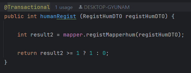 insert 는 성공 시 1 반환, 실패 시 0 반환이므로 service 단에서 삼항 연산자로 1만 return되게 설정.