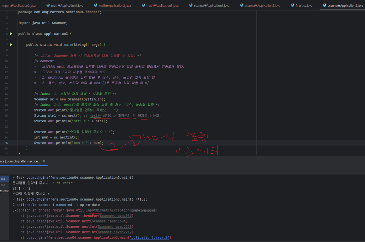 - hi만 입력을 하고 정수를 입력하면 정상적으로 동작을 한다. 하지만, hi world를 입력하게 되면 숫자를 입력하지 않았음에도 InputMismatch 오류가 발생한다.