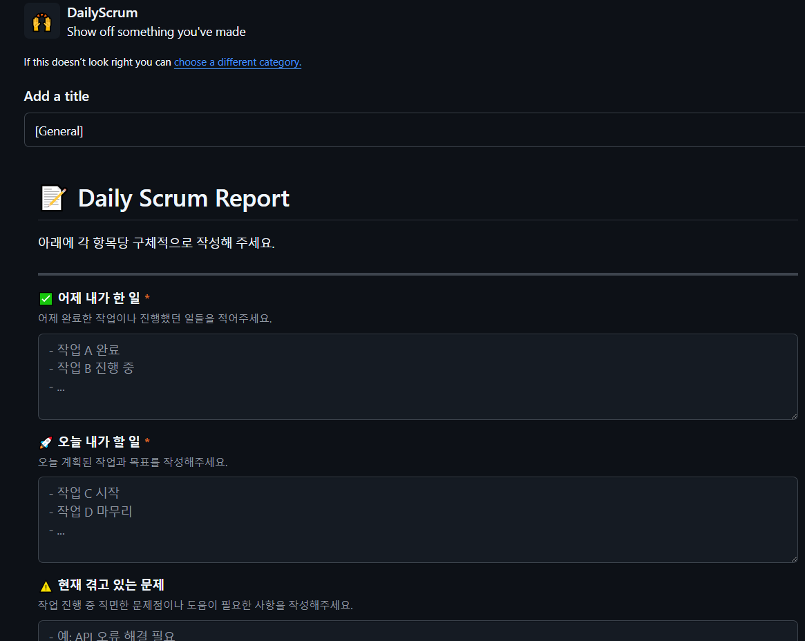 이슈 템플릿과 마찬가지로 Discussions 도 템플릿(정해진 작성 틀)이 없다면 가독성이 좋지 못할 것이다.