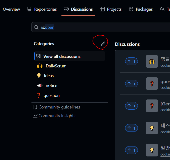 ① Discussions → 연필 모양 클릭하여 편집하기