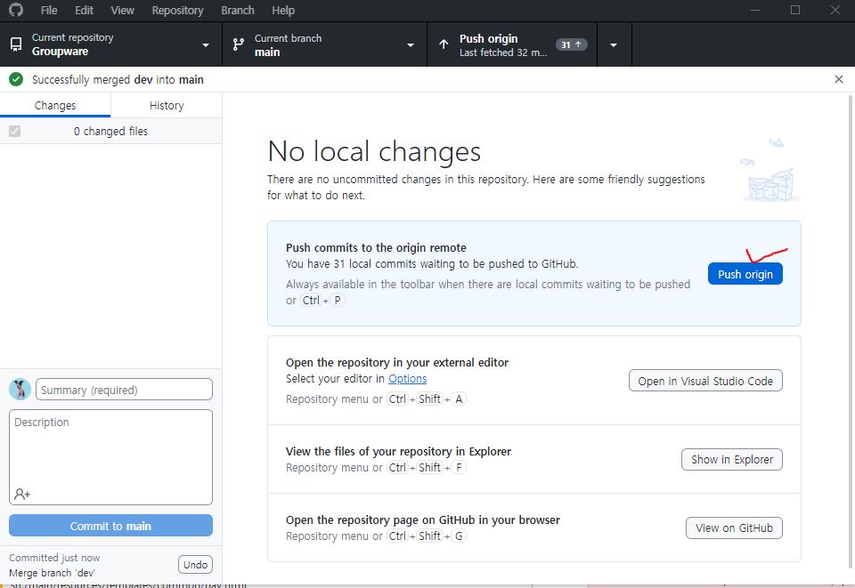 → Current branch를 merge 대상인 브랜치로 설정한다. (나는 main에 합치려고 함)