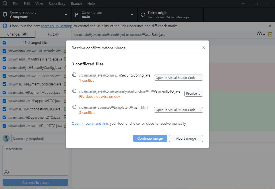 → 출돌나는 파일과 어떻게 해결할 것인가에 대한 내용이 오른쪽에 표시된다.