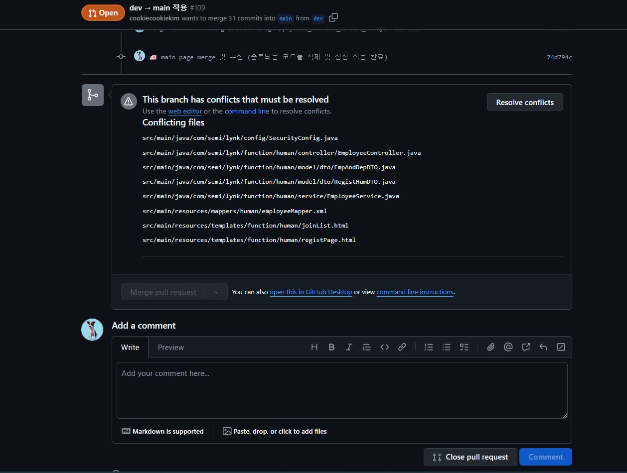 며칠 전 팀원의 풀리퀘 요청으로 머지를 하려 했지만 충돌이 많은지 버튼이며칠 전 팀원의 풀리퀘 요청으로 머지를 하려 했지만 충돌이 많은지 버튼이 비활성화 되어 있었다.