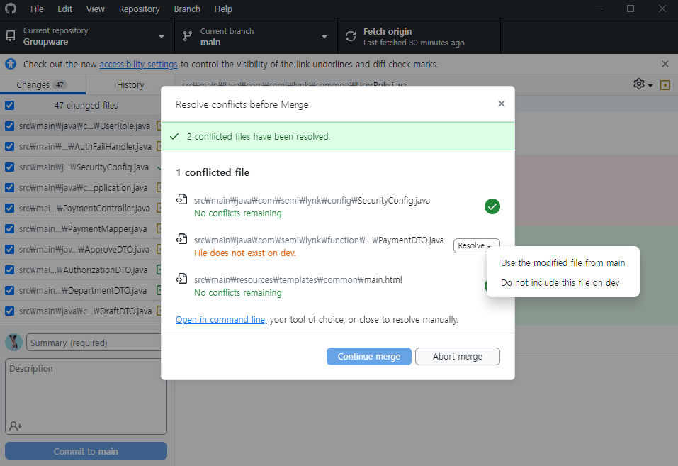 10. 충돌을 모드 제거하고 Continue merge 클릭!!
