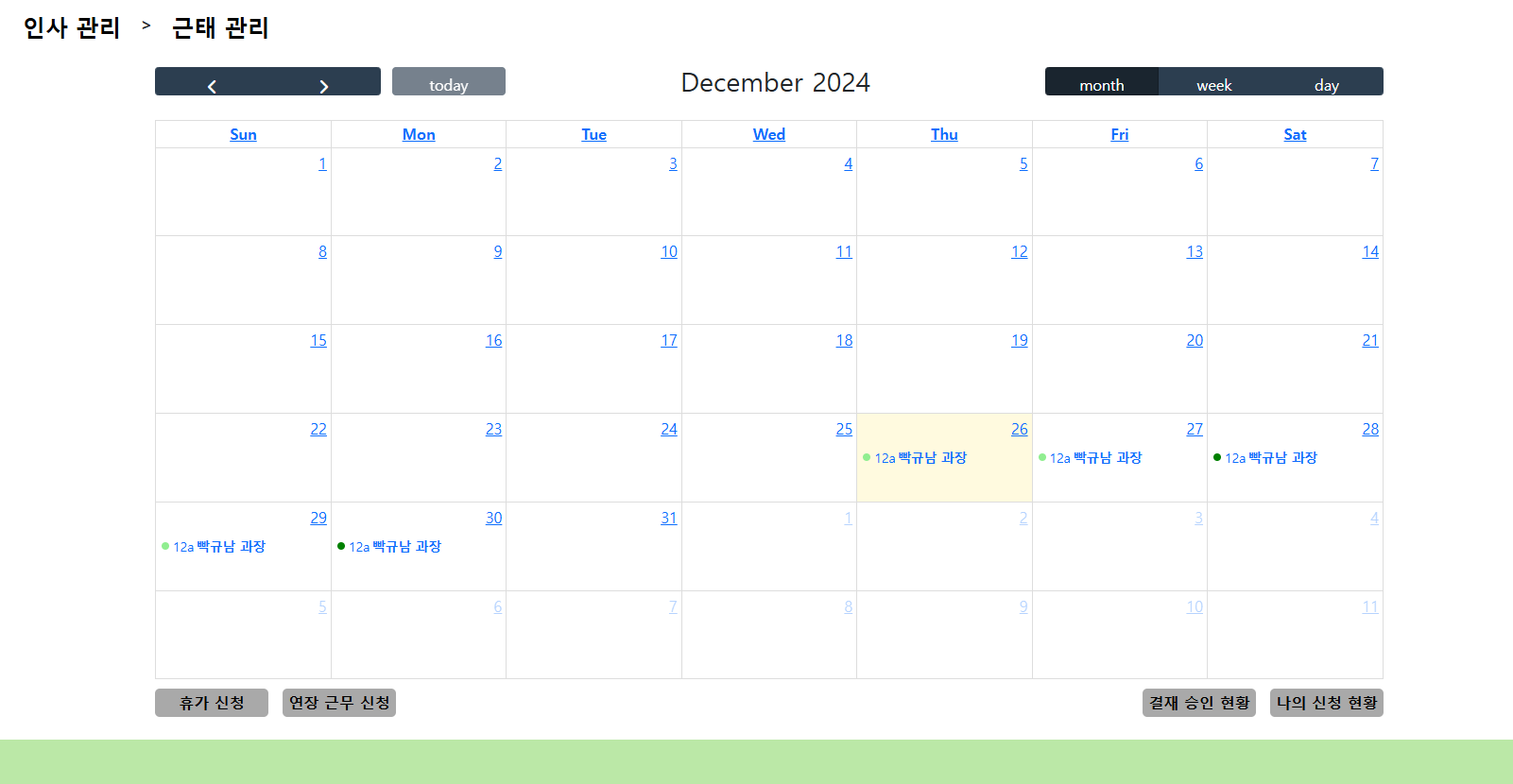 (예를 들어 26일에 반차(0.5) 신청을 하면 연두색과 이름 + 직책이 표시 / 진한 초록색은 연차)